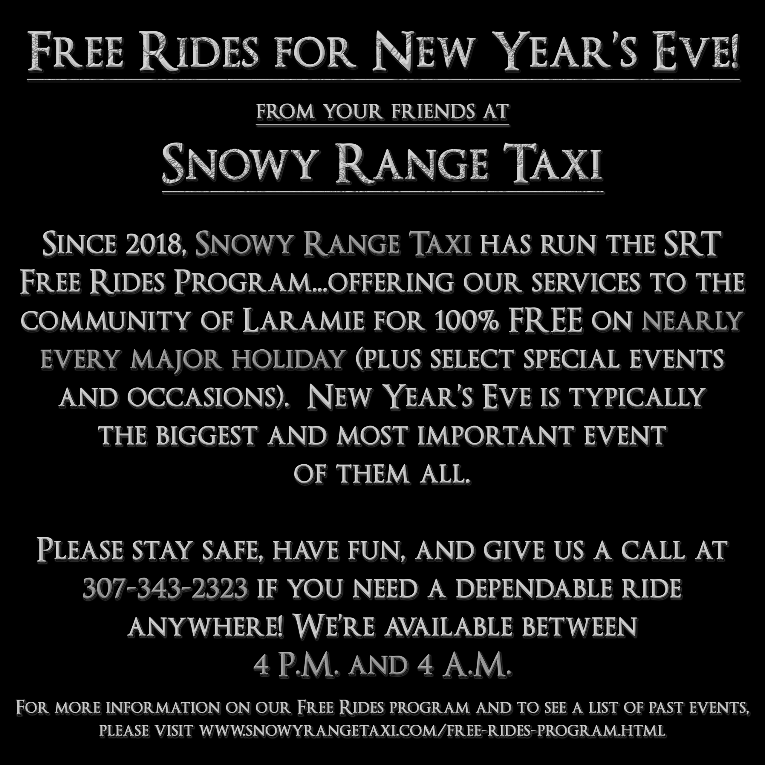 Again, ALL rides in the Laramie area are 100% FREE the ENTIRE evening and night 4pm to 4am on New Years Eve Night.