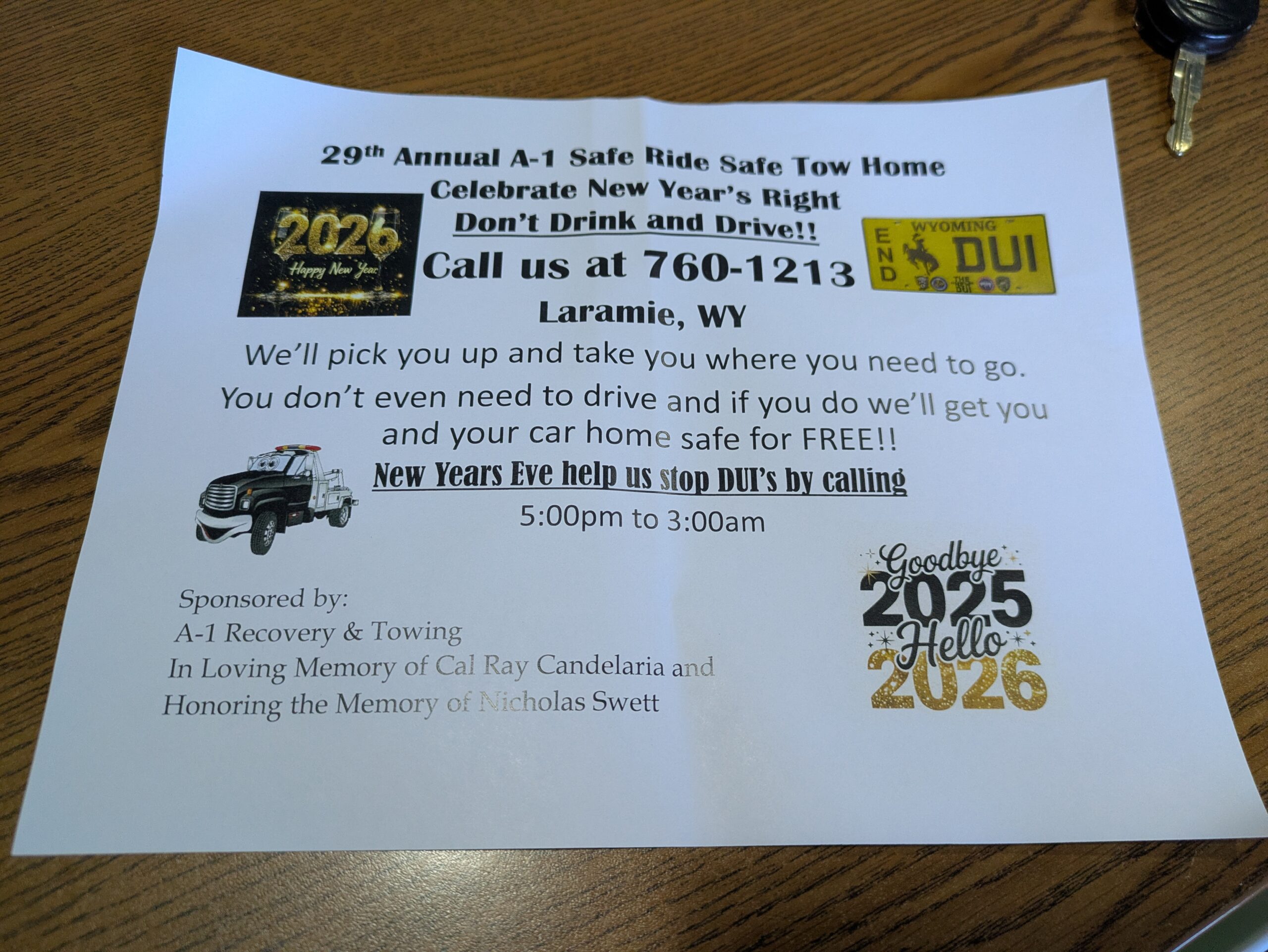 A1 Recovery & Towing is offering their 29th annual Safe Ride Safe Tow Home tonight, New Years Eve 5pm to 3am. They’ll get you AND your vehicle home safely and for free. Just call them at 760 1213