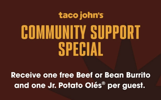 From October 31 through November 2nd Taco John’s Restaurants are offering a free to anyone affected by the Government Shutdown. Community members in need of a meal can visit Taco John’s and request the Community Support Special to receive on beef or bean burrito and one Jr. Potato Oles. The special is available 9am-11pm.
